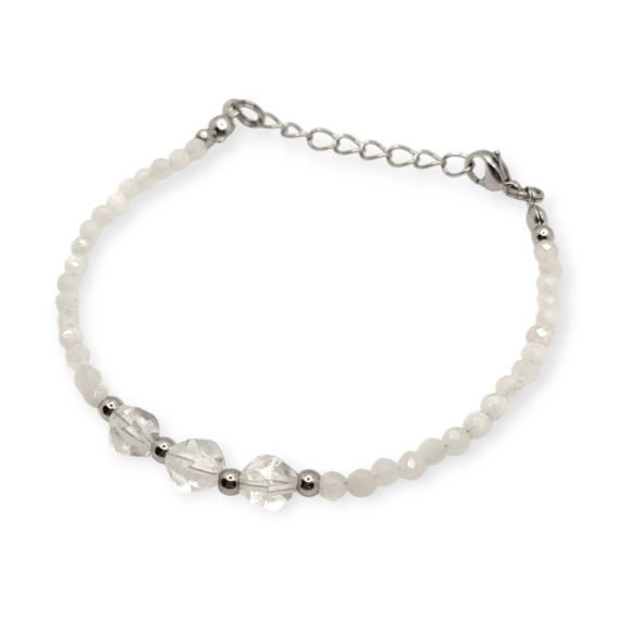 Bransoletka składa się z wytrzymałej metalowej żyłki jubilerskiej - nawleczone zostały na nią fasetowane kryształy górskie oraz kamienie księżycowe. Posiada łańcuszkową regulację z zapięciem na karabińczyk. Stanowi idealny dodatek do codziennych stylizacji.