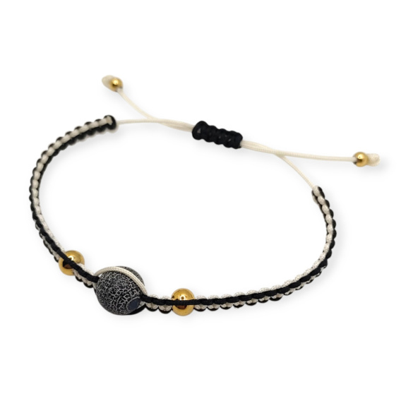 Bransoletka składa się z wytrzymałego nylonowego sznurka w kolorze czarno-kremowym, który nie traci koloru i jest bezpieczny dla skóry. Zdobi ją agat w formie kuli o średnicy 10 mm. Dzięki kwasowaniu, na kamieniu widać ciekawą fakturę, efekt "spękanej ziemi". Posiada przesuwną regulację. Stanowi idealny dodatek do codziennych stylizacji.