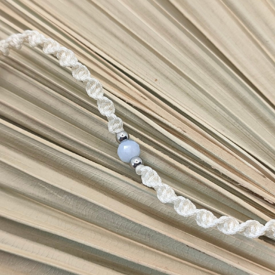 Bransoletka składa się z wytrzymałego nylonowego sznurka w kolorze kremowym, który nie traci koloru i jest bezpieczny dla skóry. Zdobią ją błękitny agat o średnicy 6 mm. Posiada łańcuszkową regulację z zapięciem na karabińczyk. Stanowi idealny dodatek do codziennych stylizacji.