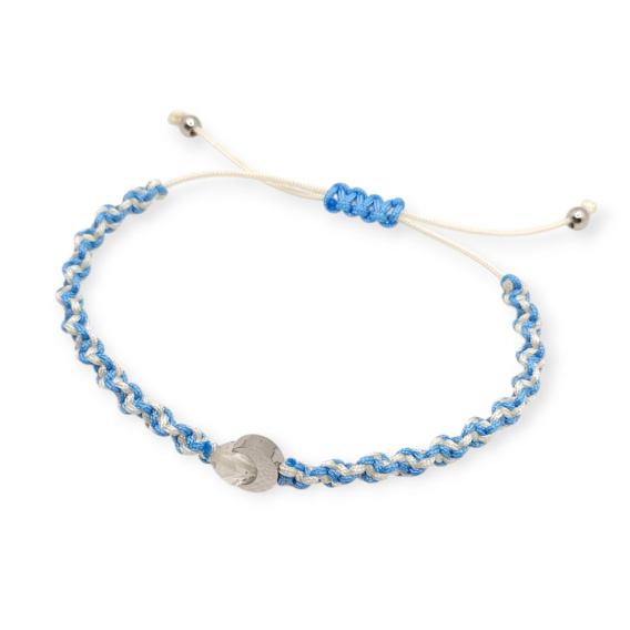 Bransoletka pleciona splotem makramowym o kolorze kremowo-niebieskim z kryształem górskim.