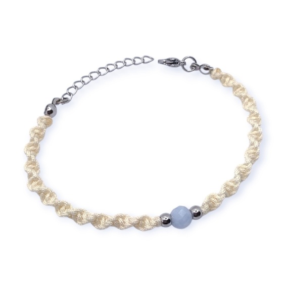 Bransoletka pleciona splotem makramowym o kolorze kremowym z błękitnym agatem.
